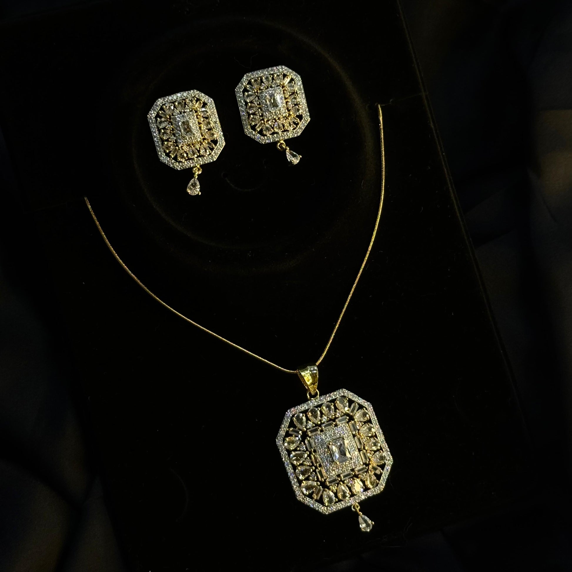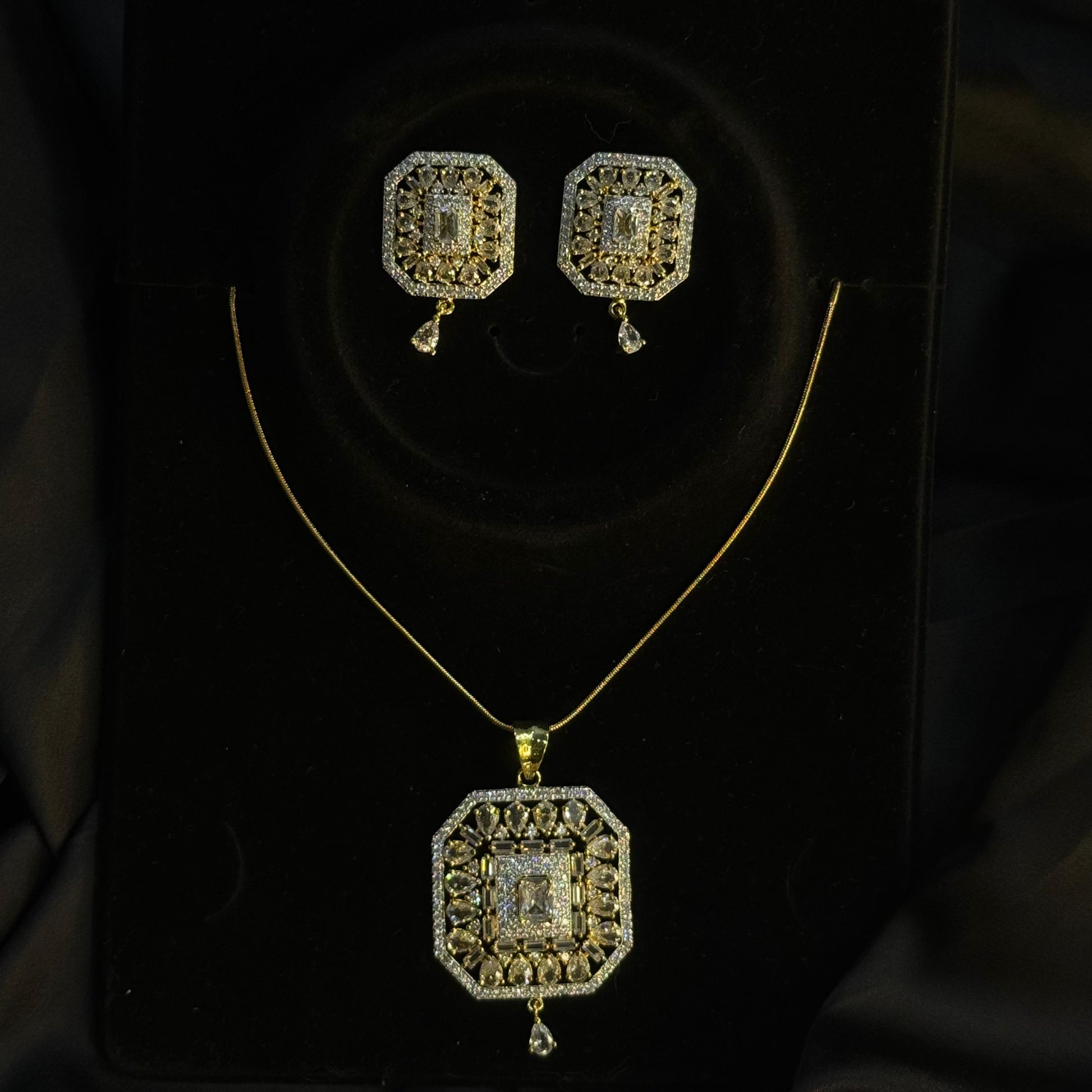 Step into timeless elegance with this Royal Square Pendant Necklace & Earring Set, a luxurious combination of tradition and modern sophistication. This gold-plated set is adorned with intricate crystal detailing and features: